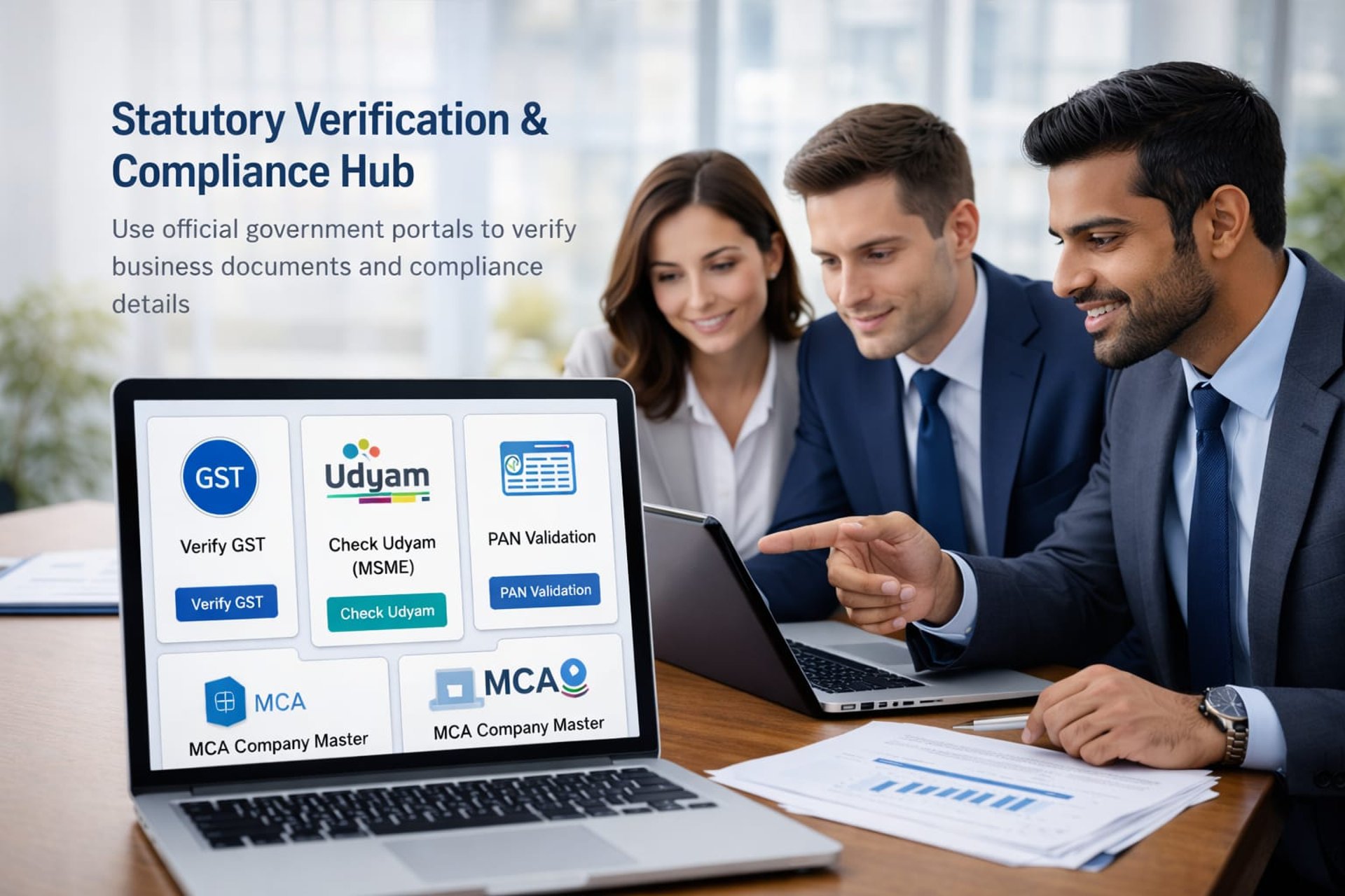 Use the official Government portals below to instantly verify key business documents and compliance details such as GST, Udyam(MSME), company master data etc.